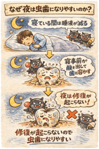 虫歯予防のためには、夜の過ごし方がとても重要です。